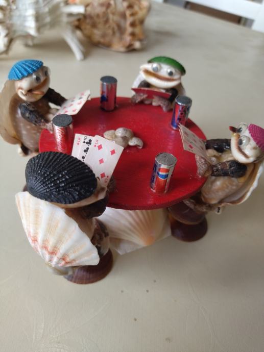 Školjke raznih vrsta i veličina, komadi bijeloga koralja i zanimljiva figurica četvorice koji kartaju izrađena od školjki.