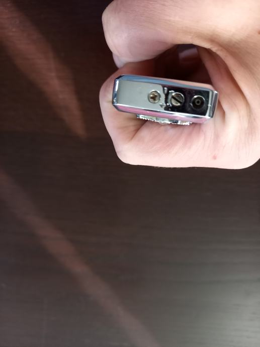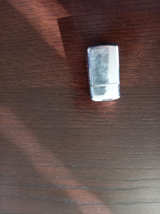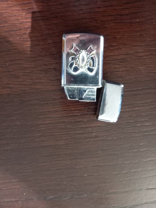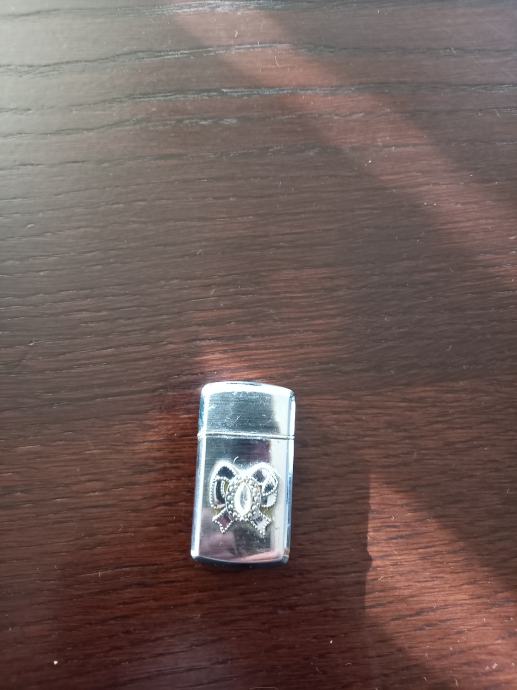 Metalni upaljač na punjenje. Mslo manje dim. od Zippa. Ima znak mašne sa ukrasima