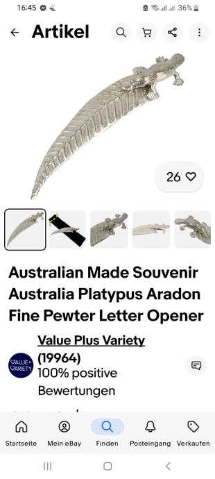 Otvarač za pisma. Suvenir Australski kljunar, masivni kositar. Dužina