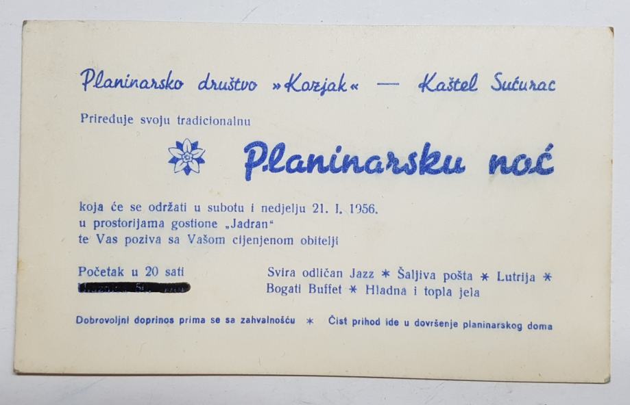 P. DRUŠTVO KOZJAK, PLANINARSKA NOĆ 1956. G. pozivnica