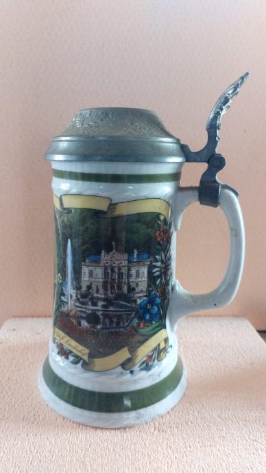 Ovaj kolekcionarski predmet je porculanski pivski vrč (tankard) s kositrenim poklopcem, koji prikazuje bavarskog kralja Ludviga II.