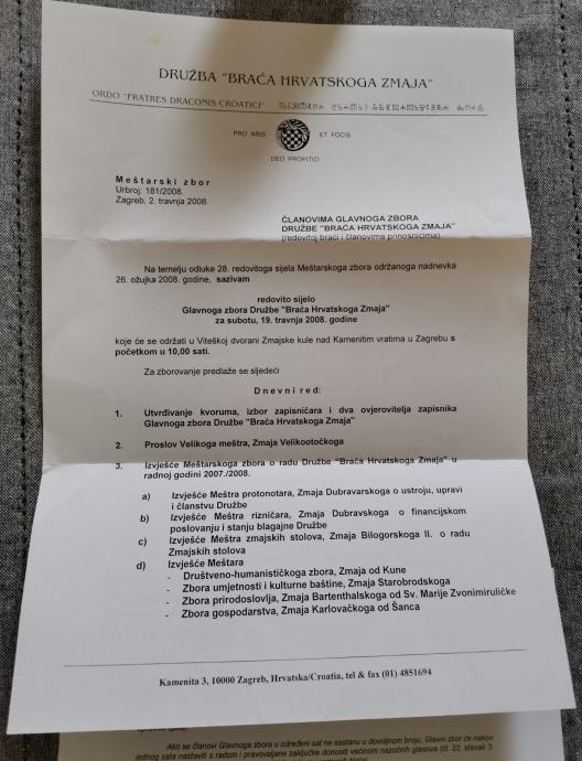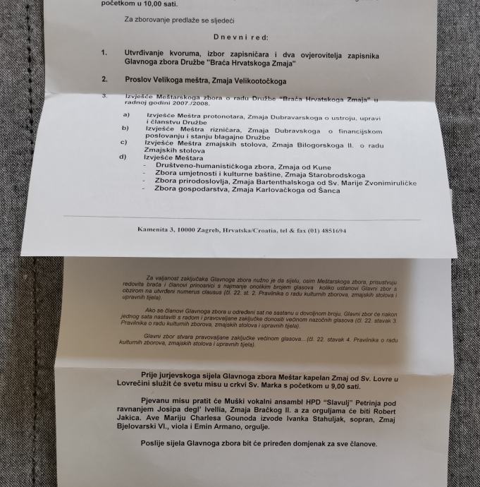 POZIV ZA REDOVITO SIJELO GLAVNOG ZBORA DRUŽBE "BRAĆA HRVATSKOG ZMAJA"