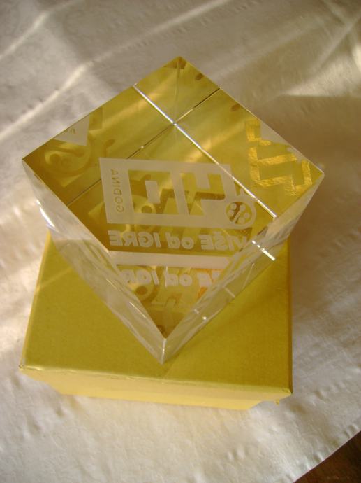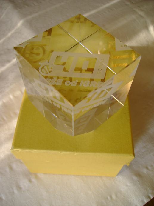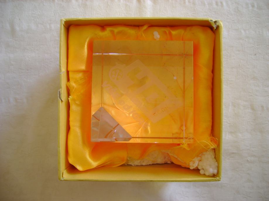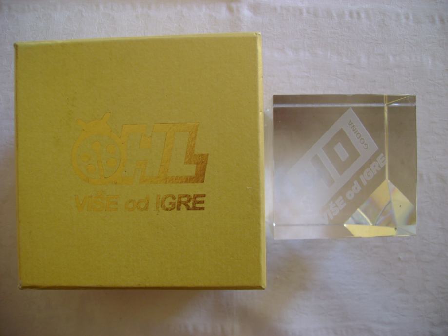 Hrvatska lutrija - Stakleni pritiskivač za papir - cca 8 x 8 cm, težina 1250 g, odlično očuvan, kutija je iznutra malo oštećena - stanje je vidljivo na slikama.