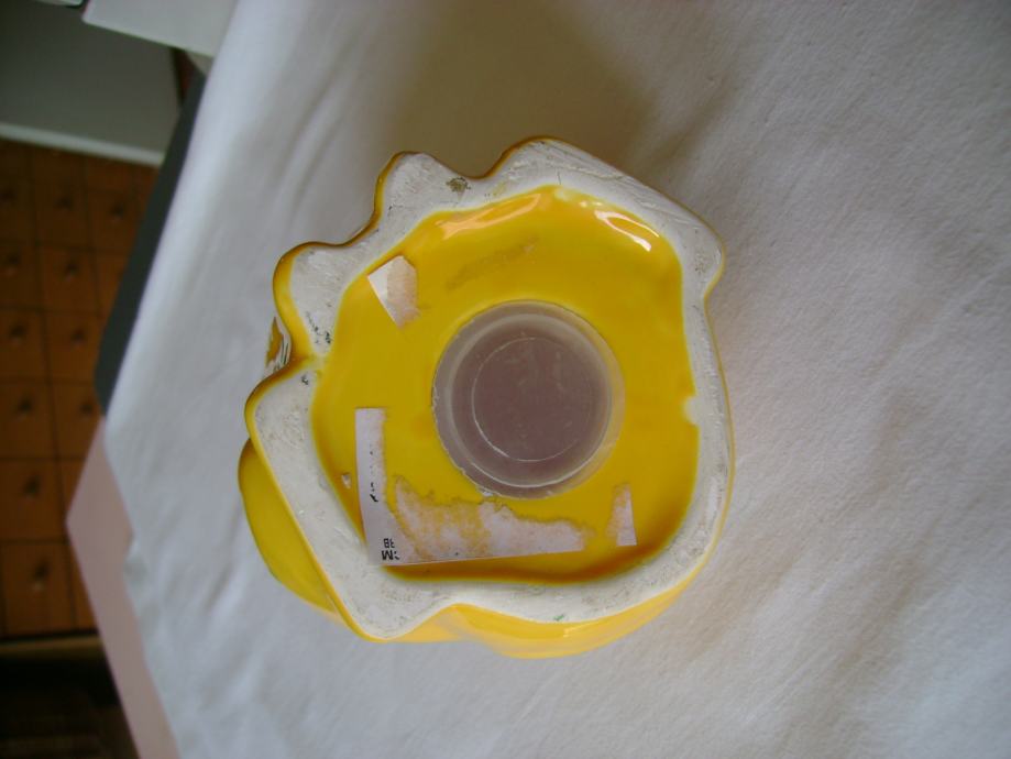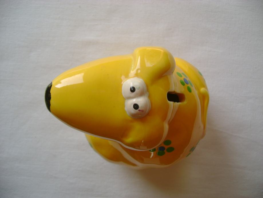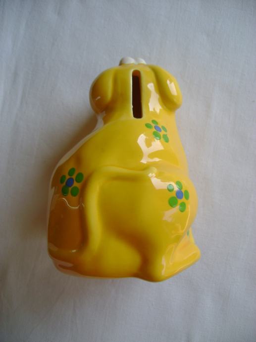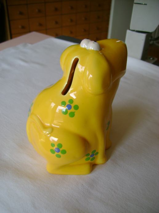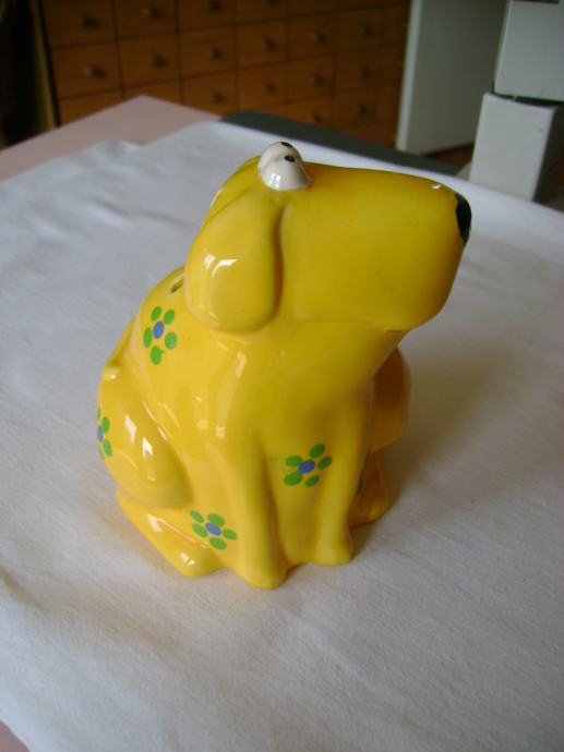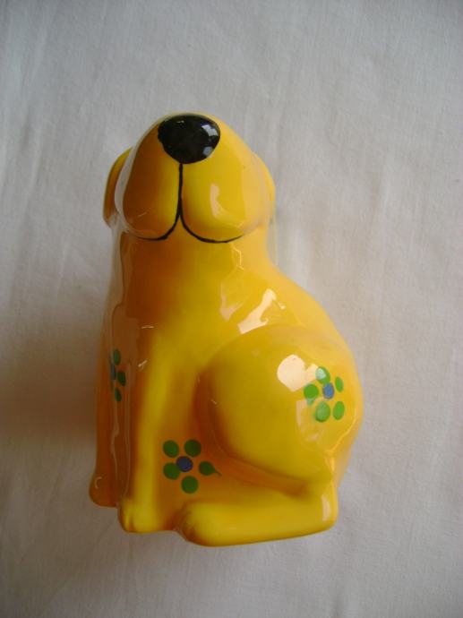 Štedna kasica Žuti psić, cca 13 x 10 x 10 cm, vjerojatno keramička, čep je malo oštećen, stanje je vidljivo na slici.