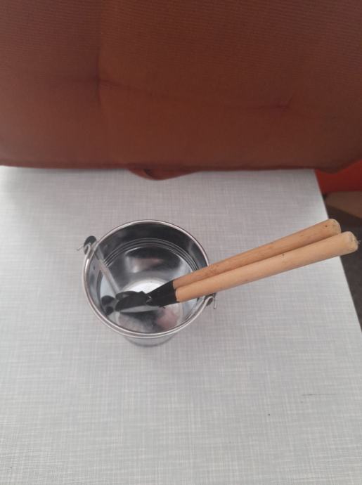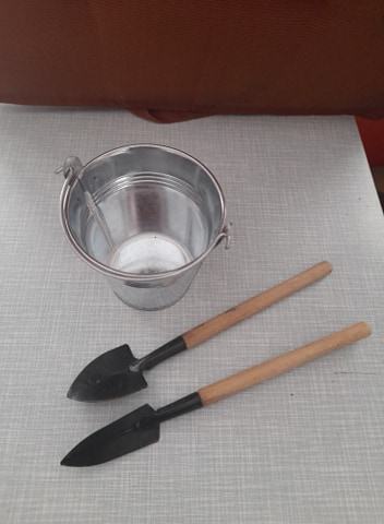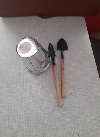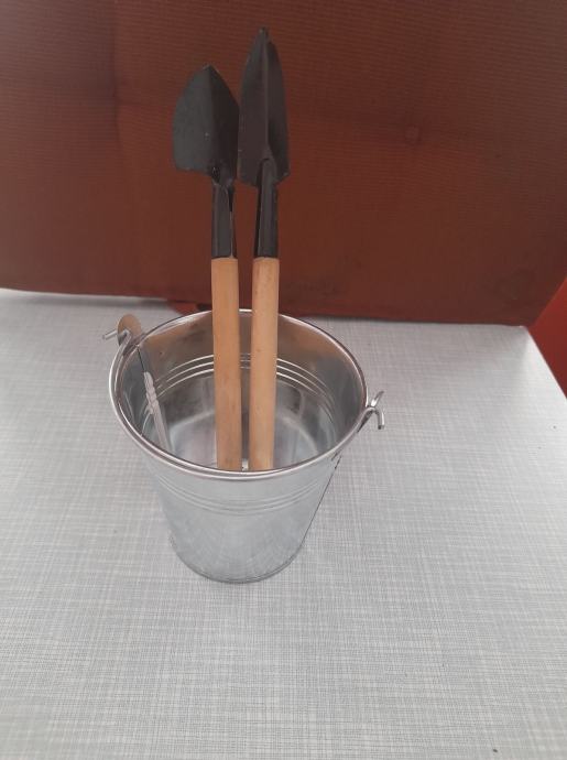 materijal lim kantica visoka 9 cm, širina gornjeg kruga 9, a donjeg 6,3 cm, lopate drvena drška, a donji dio je od željeza, dužina lopate 21 cm i 21,8 cm, vidi slike