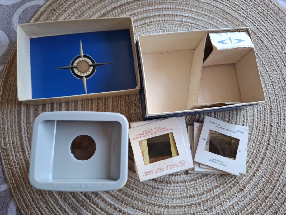 U kartonskoj kutiji nalazi se 20 dijapozitiva slavnih građevina nekdašnjeg Lenjingrada i mali projektor za projiciranje istih slika.