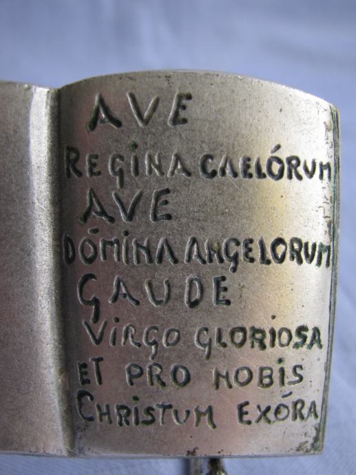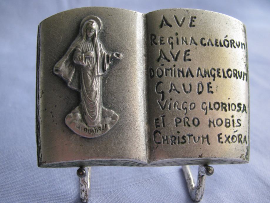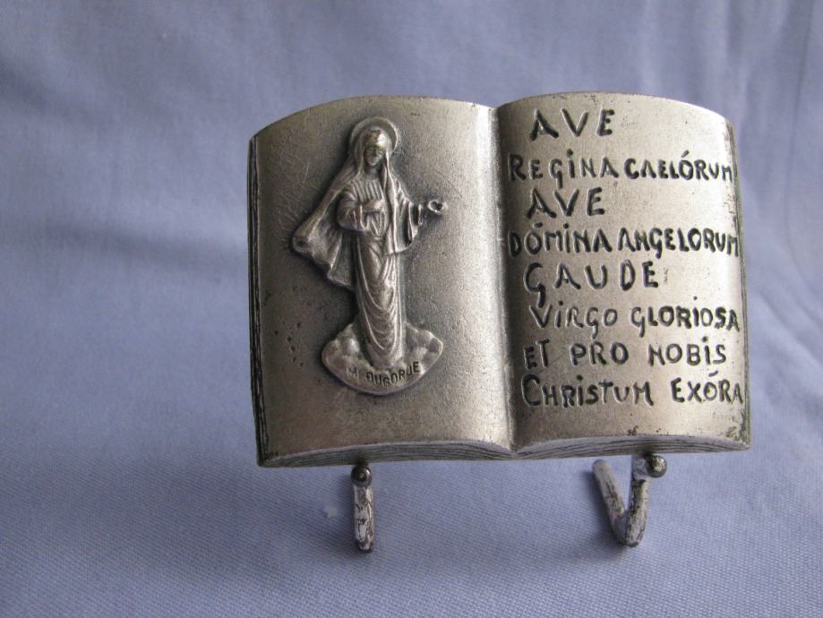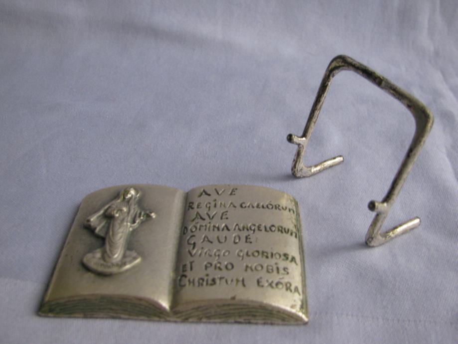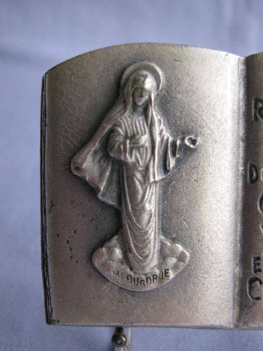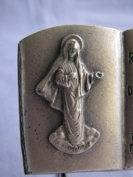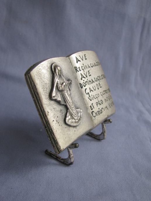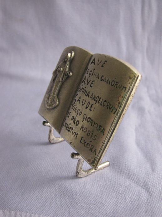 Metalni suvenir, odljev knjige sa likom M.Božje i tekstom.