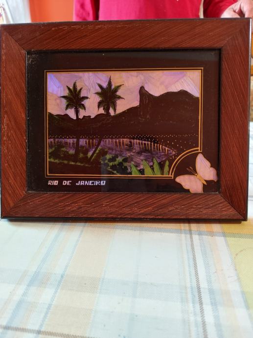 Ovo je starinski suvenir iz Rio de Janeira, Brazil, koji prikazuje pejzaž napravljen od leptirovih krila.