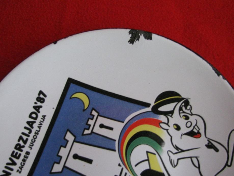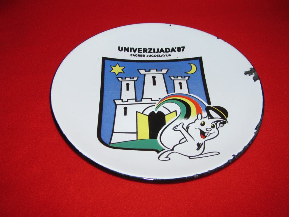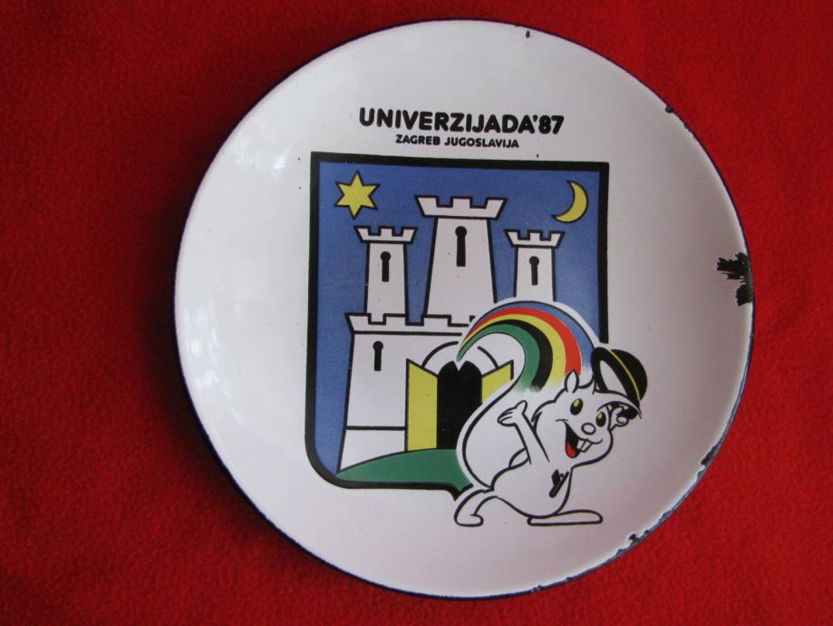 Metalni emajlirani zidni tanjur iz vremena UNIVERZIJADE 87.