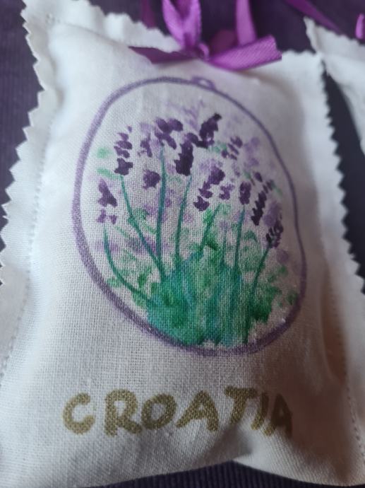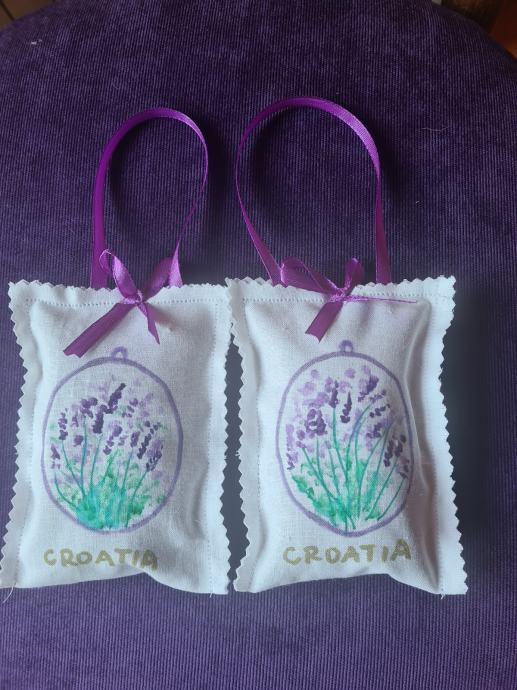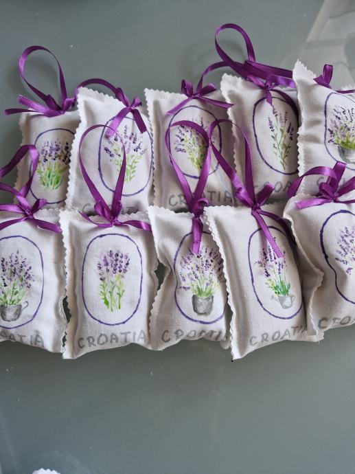 Prodajem pamučne vrećice punjene lavandom promjera 9/14cm. Ručno oslikane akrilnim bojama punjene s10do 14gr lavande. Satenska vrpca Satenska mašna.cijena pojedine vrećice 1.2 eura