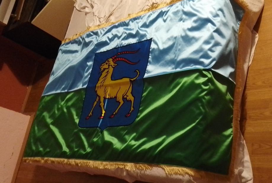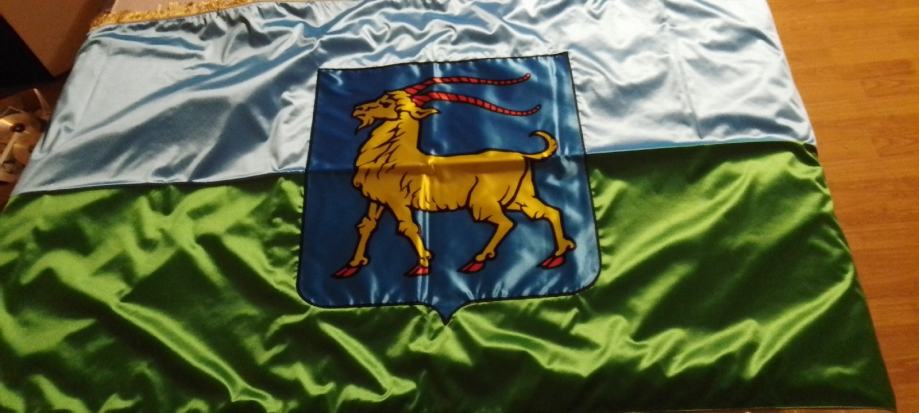 Ceremonijalni tip zastave (materijal saten), zastava je duplo skrojena, zlatne rese su sa sve 3 strane zastave, grb je zašiven sa obe strane zastave, zastava ima tunel za koplje
