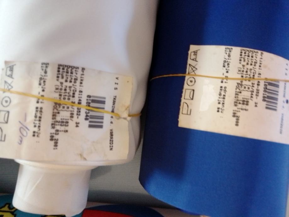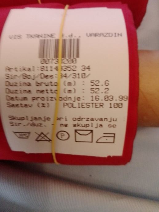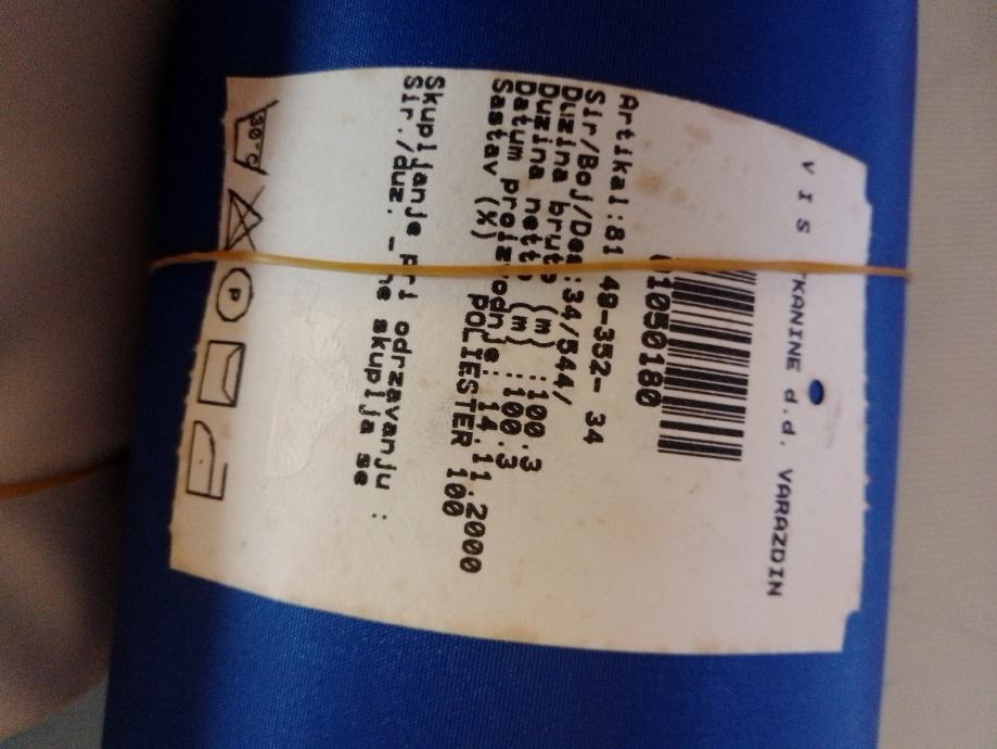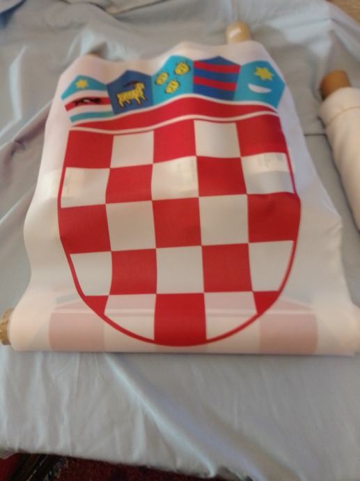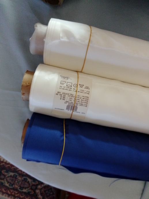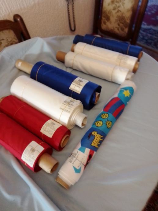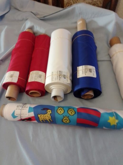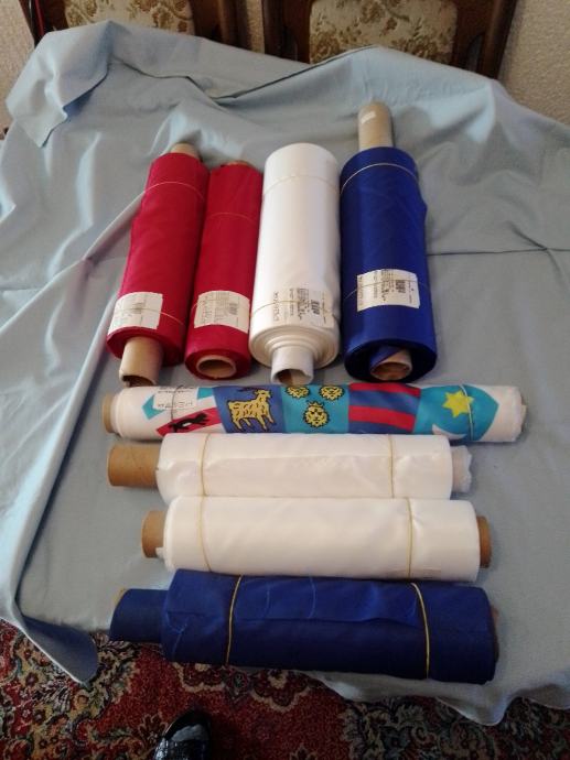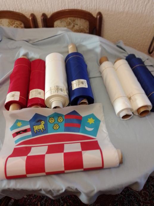 Širina materijala je 34cm a grba 50cm.crven ,bjeli ,plavi po 100met a navijački bjelo 80met plavi 40met.cijna po metru 1€ a grb 2€ po komadu.Cijena za sve 250€.Šaljem poštom uplatom na moj tekući račun+ troškovi poštarine