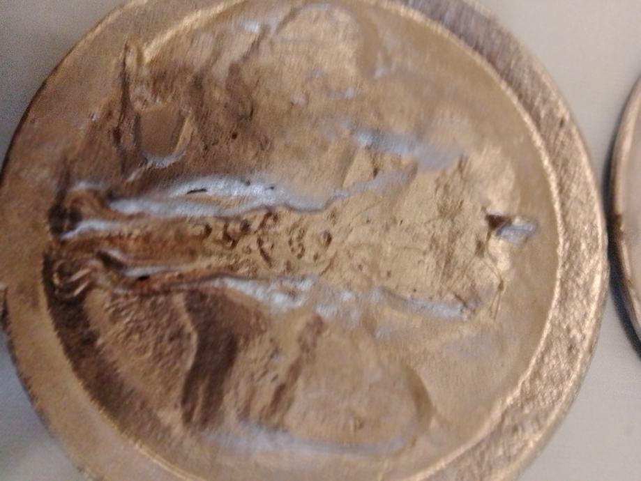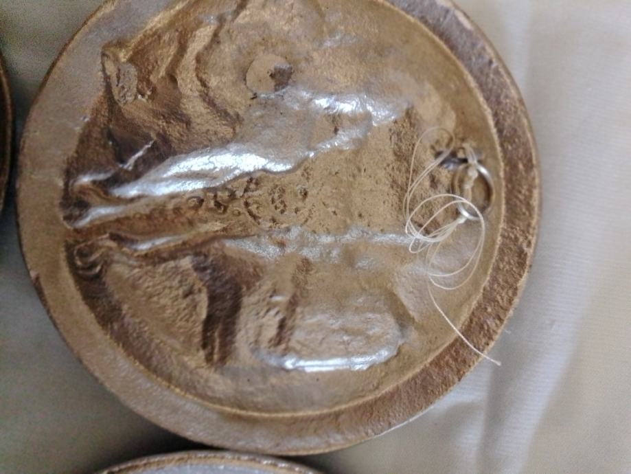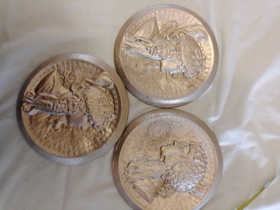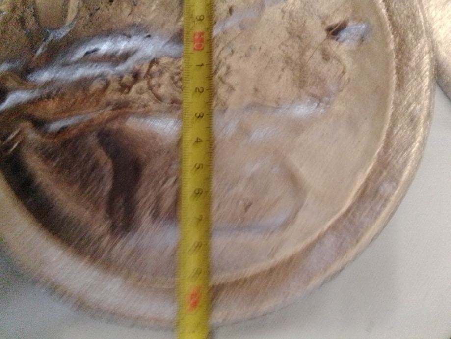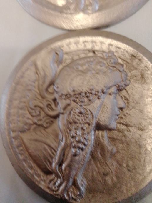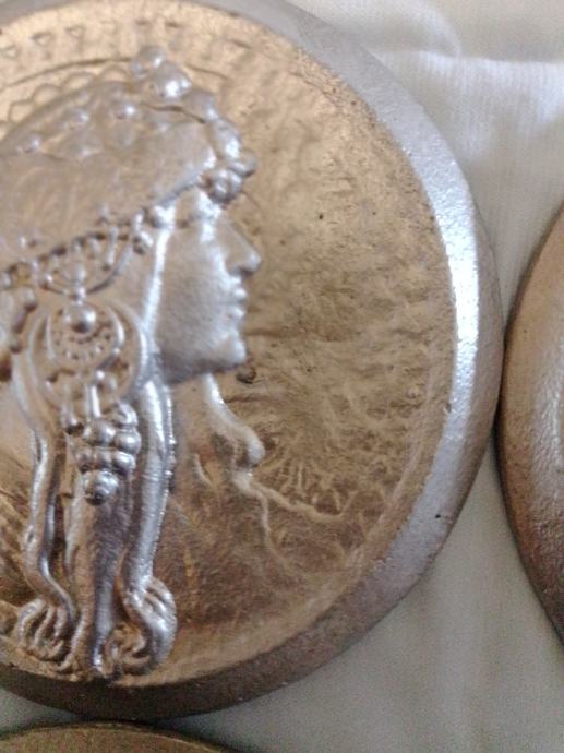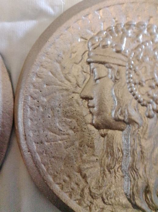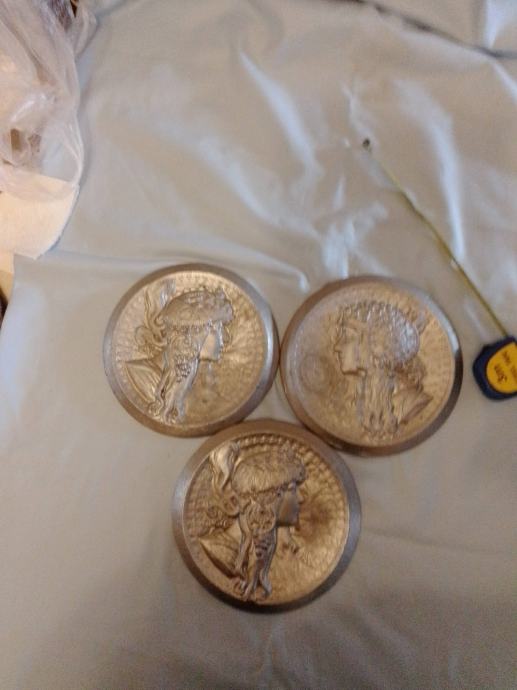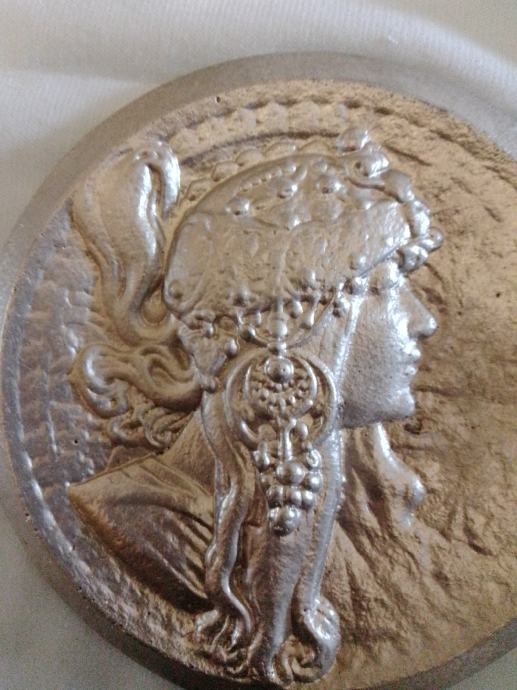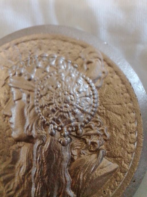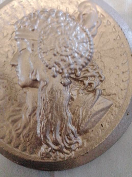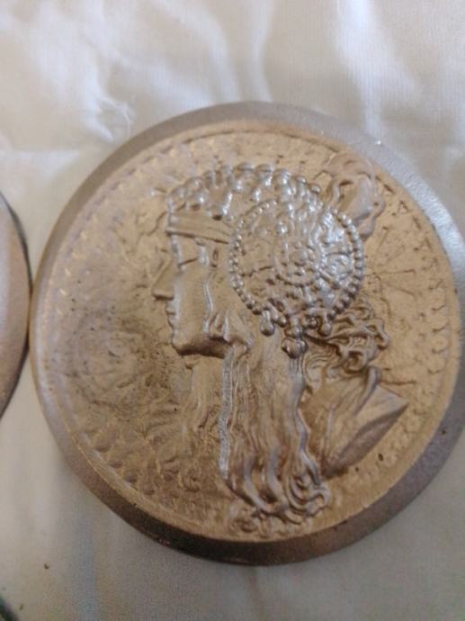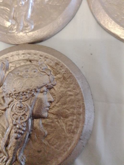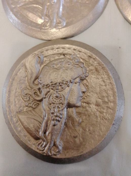 Reljefna plaketa fi 21cm od lijevanog aluminija (nebojana ,sirova)s antičkim motivim Alfonsa Mucha (1860--1939) iz1897g.Cijena za komplet 100€.Pojedinačno 35€.Šaljem poštom uplatom na moj tekući račun+ troškovi poštarine.