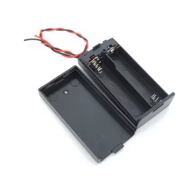 Plastična kutija za 2 AA (R6) baterije s poklopcem, prekidačem i žicama duljine 150 mm (bez konektora). Dimenzije kutije: 69×33×19 mm.