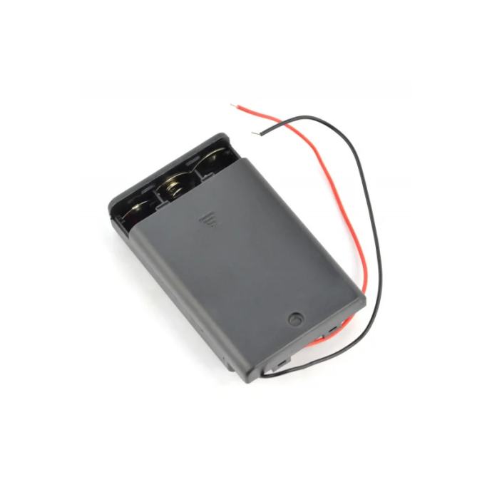 Plastična kutija za 3 AA (R6) baterije s poklopcem, prekidačem i žicama duljine 150 mm (bez konektora). Dimenzije kutije: 69x48x18 mm.