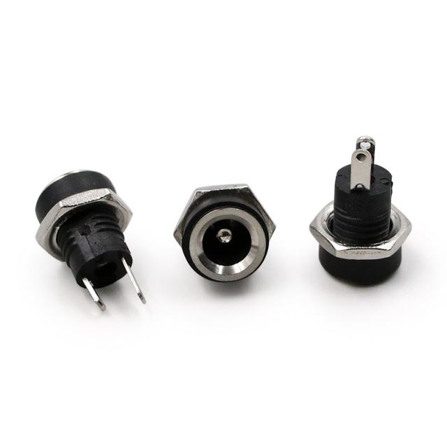 Montažni DC konektor za 5.5x2.1x9 mm konektore, maksimalno 3A/12V, maksimalna debljina panela 3 mm, dimenzije 10x10x18 mm.