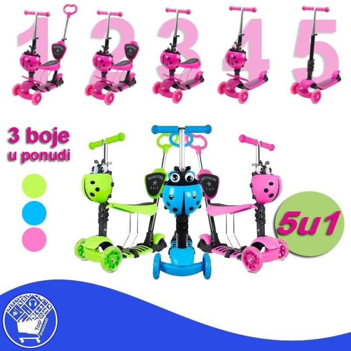 Iznenadite Vašu djecu sa ovim zanimljivim skuterom veselih boja sa tri šarena kotača i korpicom u obliku vesele bubamare.