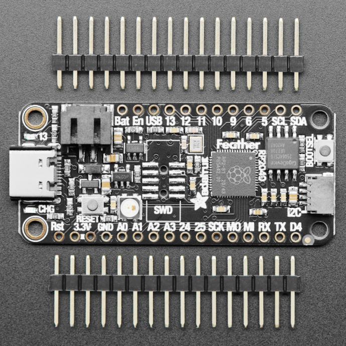 Najnovija pridošlica u Feather obitelj, ova pločica bazirana je na Raspberry Pi RP2040 mikrokontroleru (dual core 32-bit ARM Cortex M0+ @ 133MHz), istome koji koristi i Raspberry Pi Pico. Programirati se može u CircuitPythonu, MicroPythonu ili C/C++ (od nedavno postoji podrška za Arduino IDE, može se koristiti i VS Code).