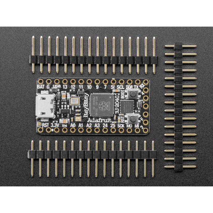 Raspberry Pi RP2040 mikrokontroler dolazi i u ItsyBitsy formatu - dual core 32-bit ARM Cortex M0+ @ 125MHz (isti koji koristi i Raspberry Pi Pico) okružen je s fantastična 23 GPIO pina! Od toga su četiri 12-bit analogni ulazi, a 16 PWM izlazi. Programirati se može u CircuitPythonu, MicroPythonu ili C/C++ (od nedavno postoji podrška za Arduino IDE, može se koristiti i VS Code).