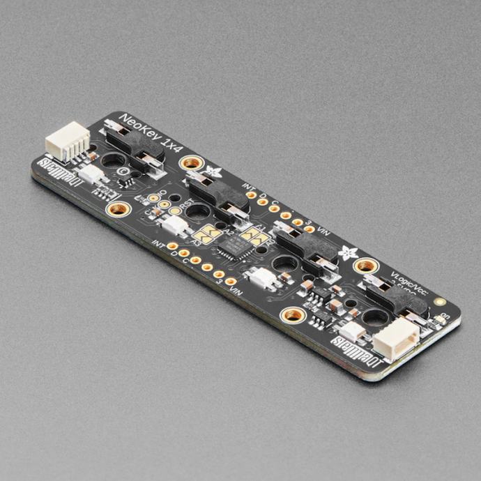 Adafruit NeoKey 1x4 QT I2C može primiti četiri Cherry MX kompatibilne tipke i jednostavno se koristi na eksperimentalnoj pločici ili putem easyC/Qwiic/Stemma QT kabela. Za kontrolu pločice potreban je mikrokontroler, a tipke i kapice nisu uključeni u paket - možete koristiti bilo koje Cherry MX kompatibilne tipke.