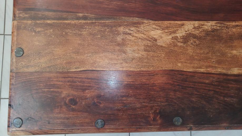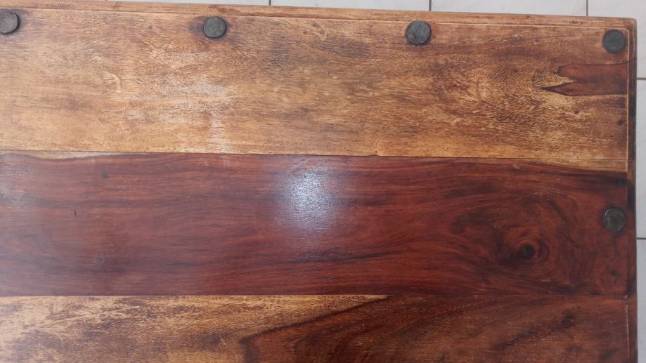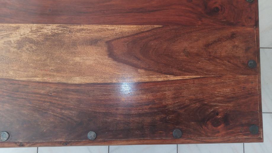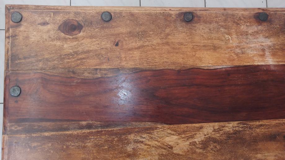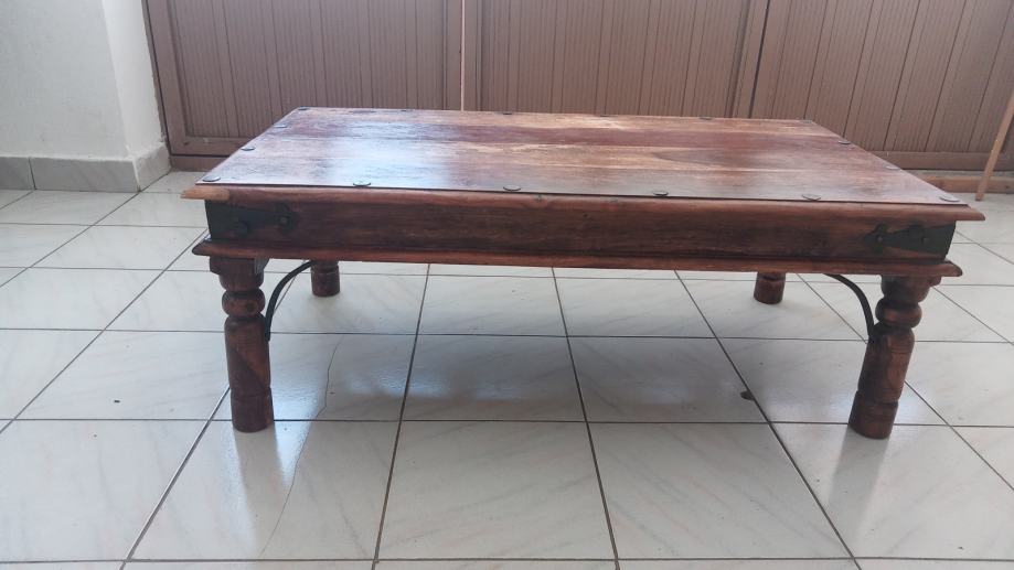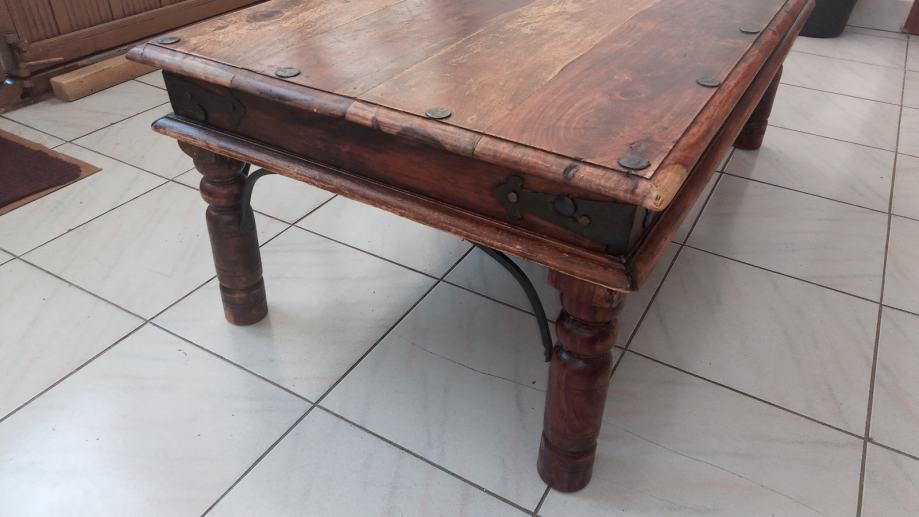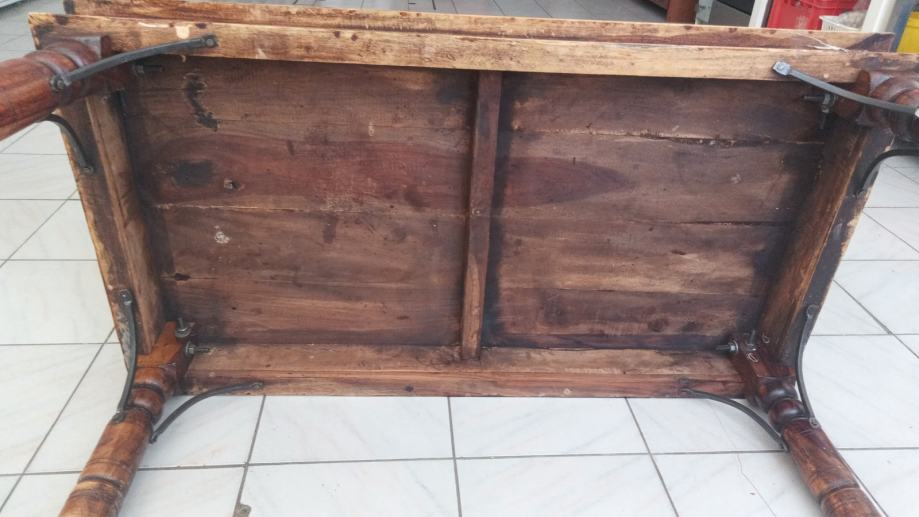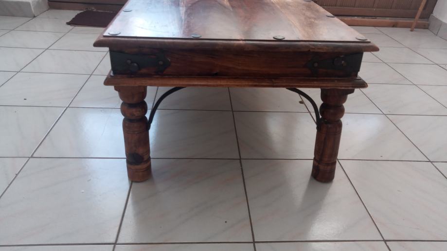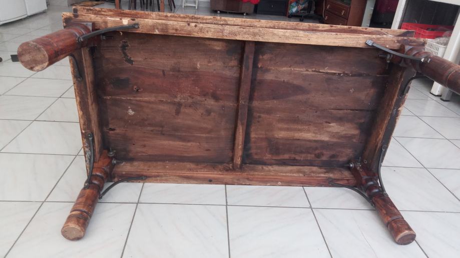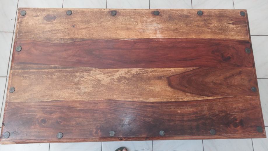 Stol dimenzija: dužina 110cm, širina 60cm,visina 40cm.puno drvo,ručno rađen,čvrst sa zakovicama.