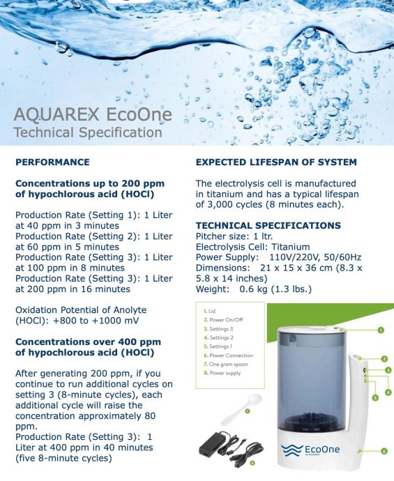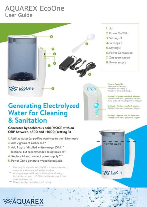 Umjesto skupih i opasnih kemikalija, uređaj koristi samo vodu, sol i struju te stvara 100% prirodno, netoksično i ekološko sredstvo koje uništava 99,9 % bakterija, virusa i gljivica (uključujući Norovirus, E. coli, Salmonelu, Listeriju, MRSA).