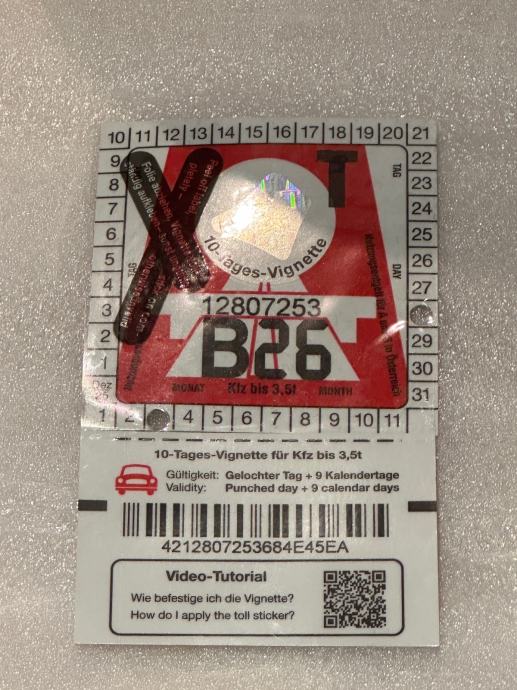 Austrijska vinjeta kupljena 28.03.26. Vrijedi 10 dana od datuma kupnje.