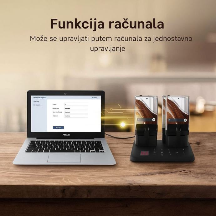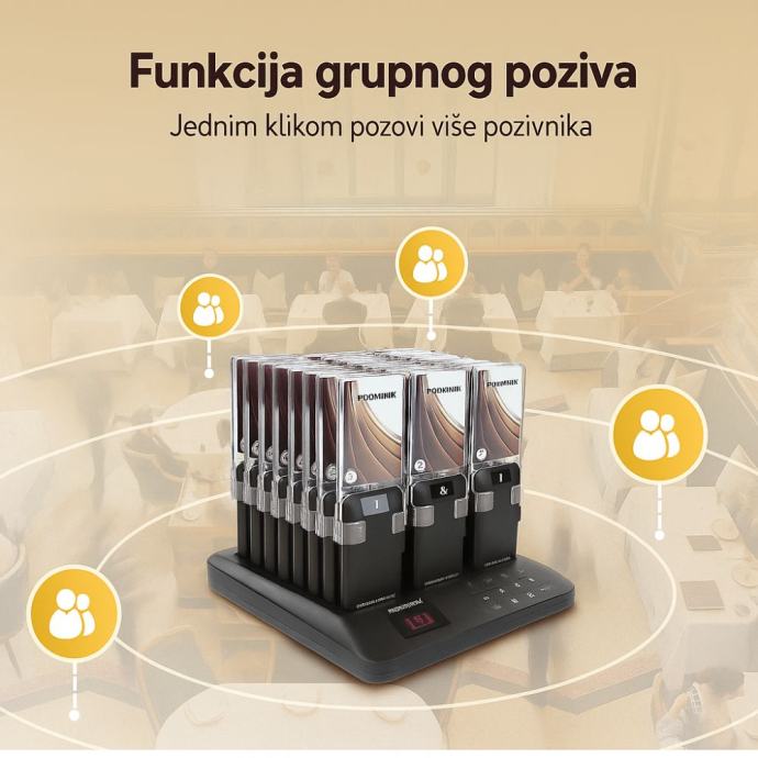 Sustav uključuje 24 bežična pagera koji se lako upravljaju putem intuitivne tipkovnice. Gosti dobivaju jasan signal kad je njihova narudžba spremna – putem zvuka, svjetla ili vibracije. Time se izbjegavaju gužve na pultu i omogućuje bolja organizacija u radu.