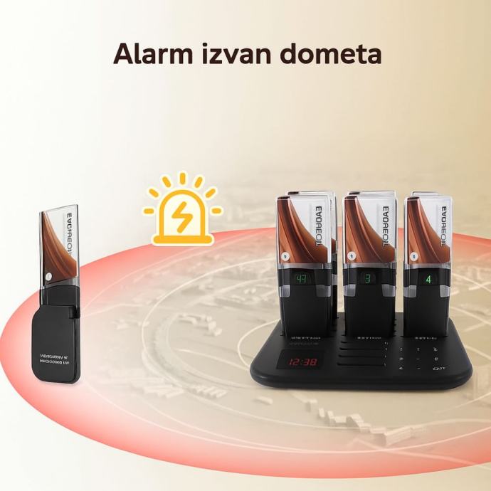 Uređaj ima domet do 800 metara na otvorenom, što ga čini prikladnim i za veće objekte ili terase. Alarm izvan dometa štiti od gubitka pejdžera jer odmah aktivira upozorenje ako se uređaj previše udalji.