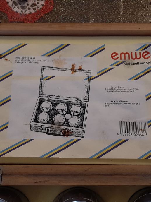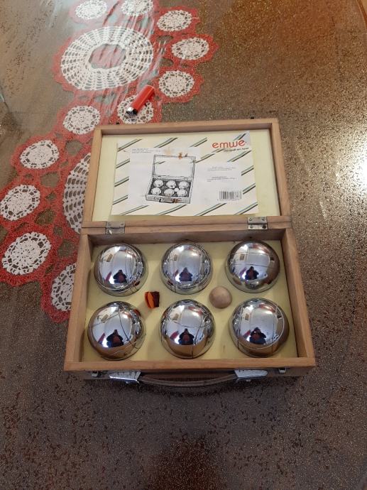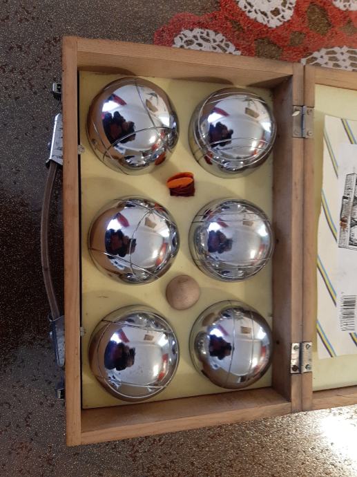 Komplet boće za boćanje u drvenoj kutiji,metalne svaka boće težine 720grama,stanje očuvane malo rabljene,dostava i tiskom po dogovoru