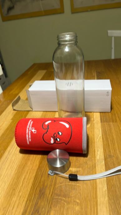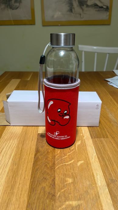 Bočica od stakla , sa navlakom od tkanine ( zadržava toplinu i štiti od udaraca )