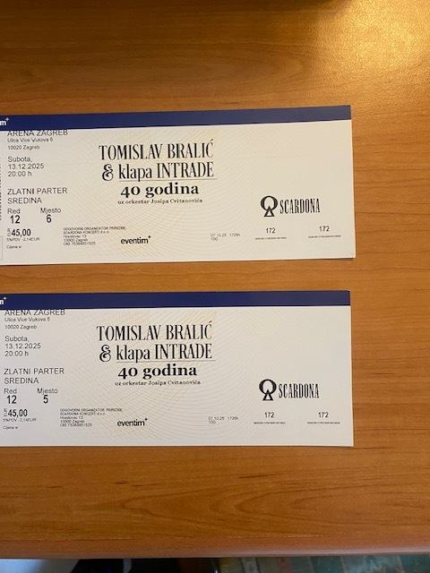 Prodajem zbog bolesti dvije karte za koncer u Areni. Bralić &Intrade 13.12.
