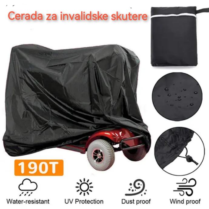 U ponudi se nalazi univerzalna nova cerada/pokrivač za električne invalidske skutere dužine 150cm, širine 75cm, visine 130cm. Ove dimenzije cerade odgovaraju svim skuterima bez obzira na ime proizvođača i marku.