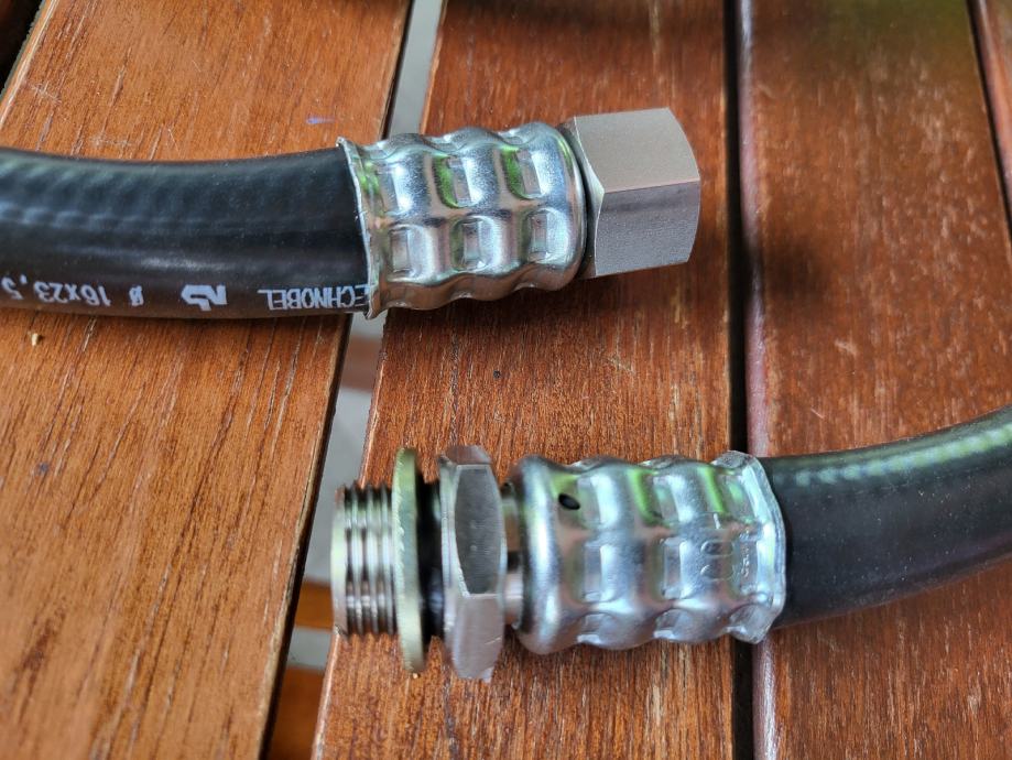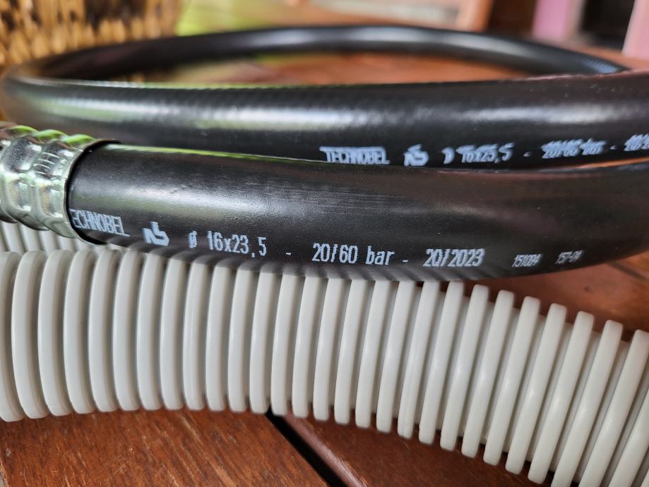 Novo industrijsko crijevo namjenjeno za rashladnu tekučinu pod tlakom 20/60 bara promjera 16*23,5 s nehrđajučim orginalno prešanim krajevima pola cola( muško/ ženski). Crijevo je dugo 1500 mm i ima još rebrasto crijevo za dodatnu zaštitu. Imam 4 kom.