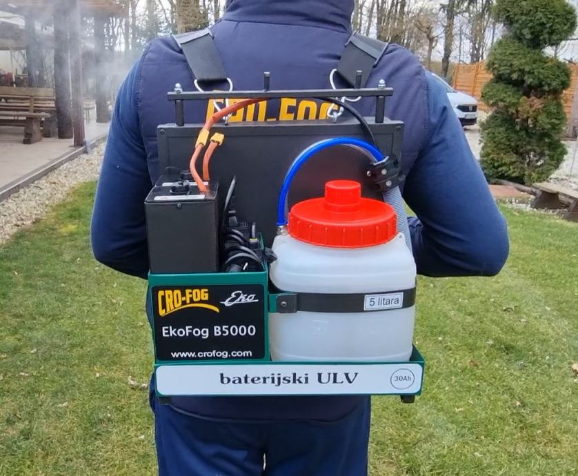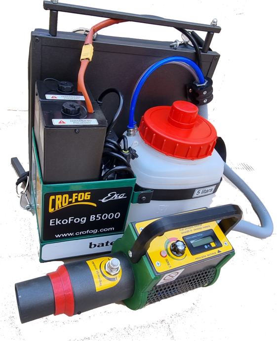 EkoFog B5000 baterijski ULV hladni zamagljivač namjenjen je za dezinfekciju prostora, zaštitu od insekata, prihranu bilja, zaštitu bilja od bolesti,liječenje stoke aerosolom i za razne druge namjene apliciranja na vodenoj bazi.