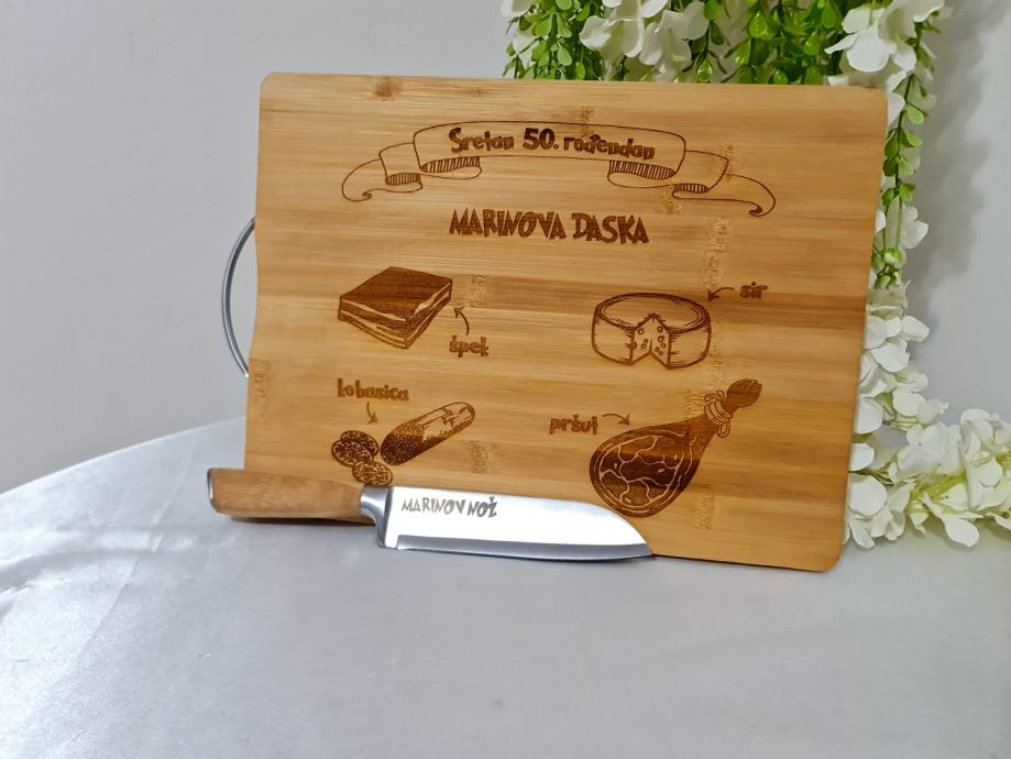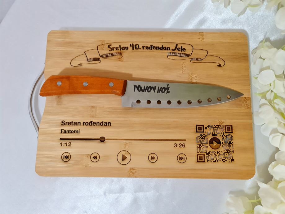 Natpis je rađen sa laserom te je na taj način trajno urezan u dasku i nož.