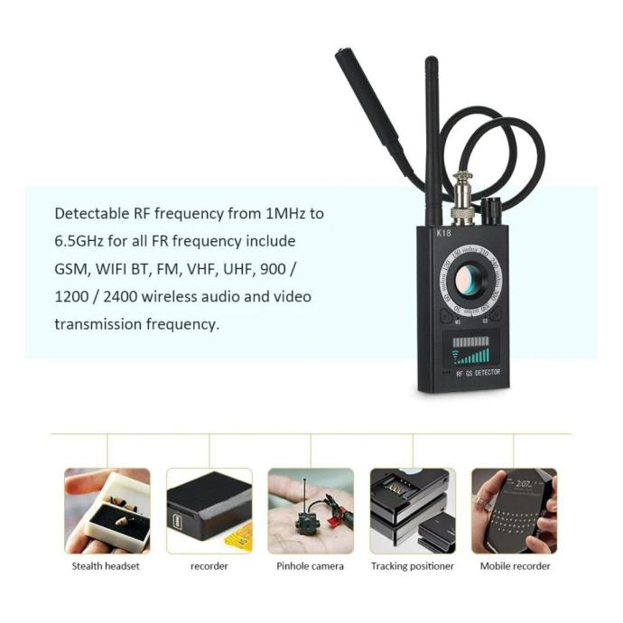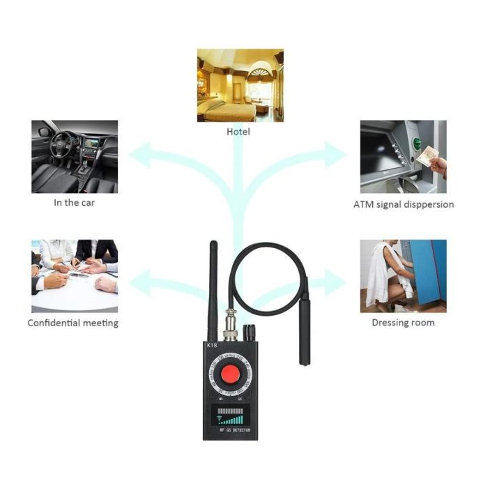 Detektor pokriva RF frekvencije od 1MHz do 6.5GHz, uključujući GSM, WIFI, Bluetooth, FM, VHF, UHF, te frekvencije bežičnog audio i video prijenosa. Idealan je za domove, urede, hotele, automobile, kupaonice, svlačionice, poslovne pregovore, povjerljive sjednice, tvornice, istraživačke sobe, vojna postrojenja, vladine agencije te mjesta za zabavu. Također, može poslužiti kao monitor za školske ispite kako bi se spriječilo prisluškivanje, fotografiranje, snimanje videa ili zaštita od zračenja.