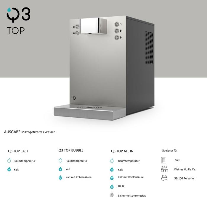 Personalizirani sustavi stolne vode moderno su i elegantno rješenje za tvrtke koje cijene individualnost. S personaliziranom prednjom stranom od stakla, aluminija, mramora ili Corian-a (Q1 i Q2), sustavi stolne vode mogu se savršeno prilagoditi korporativnom dizajnu.