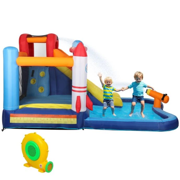 5-u-1 dizajn: Ovaj uzbudljivi dječji dvorac na napuhavanje kombinira bazen za djecu, visoki tobogan, zid za penjanje, područje za skakanje i vodenu podlogu kako bi vaše dvorište pretvorio u mini vodeni park. Dovoljno velik za troje djece.