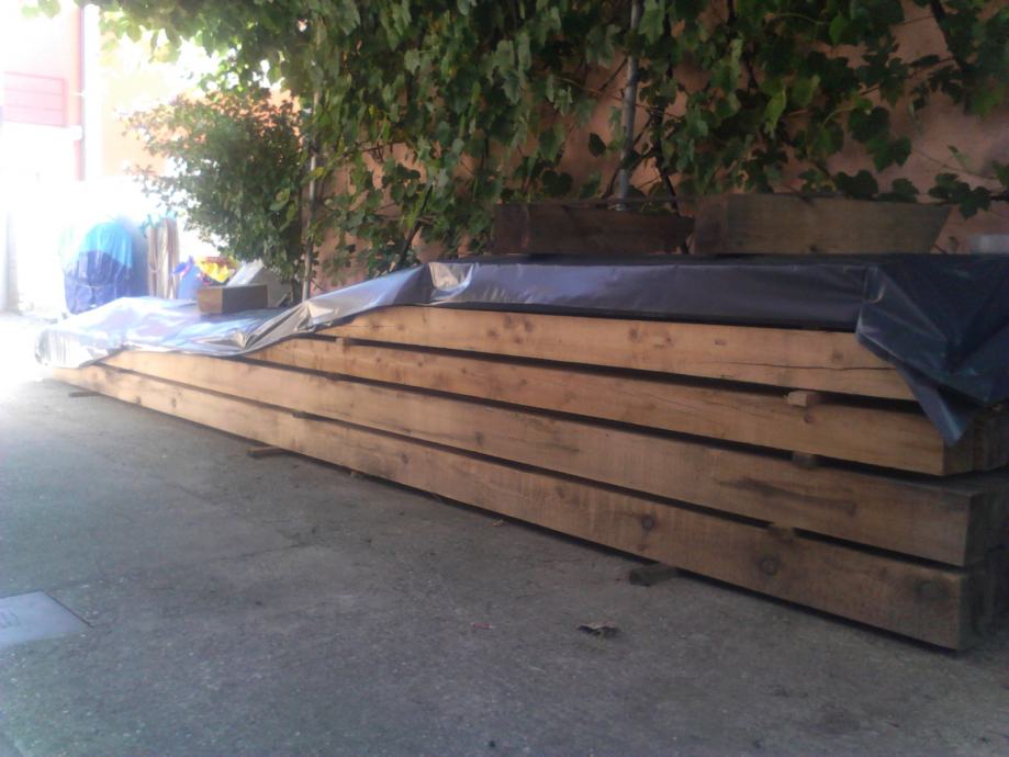 Ima i nešto greda od 3 i 4 metra,građa je ostatak od gradnje krovišta,pokrivena je tako da nije kisnula.