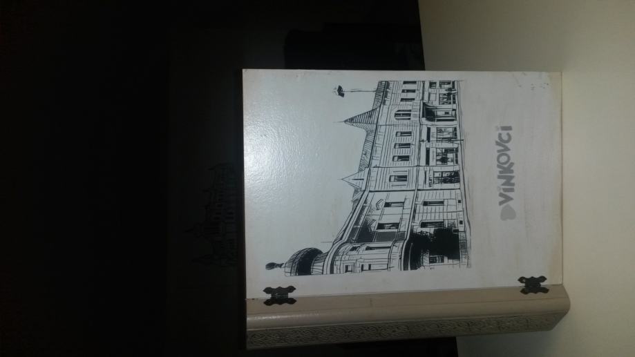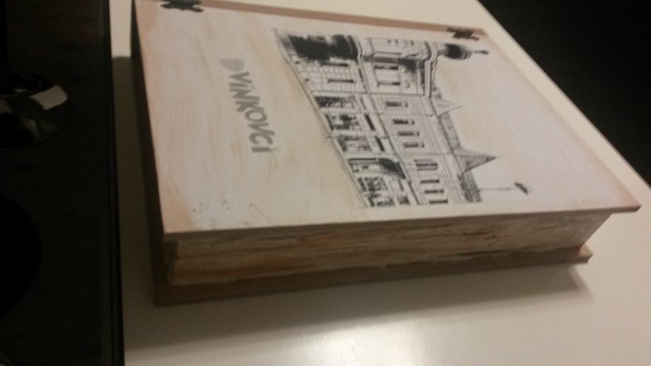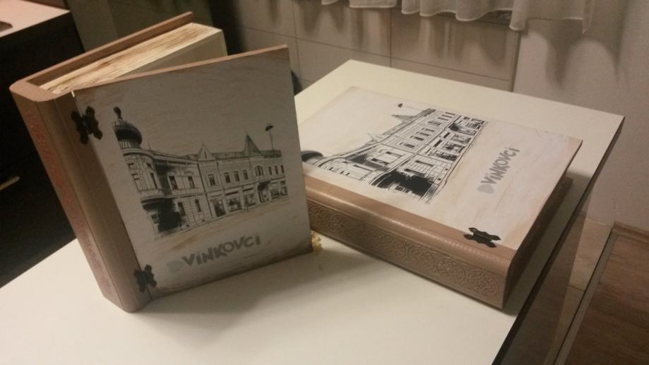 Prodajem drvene kutije, u obliku knjige, sa motivom Vinkovaca.
