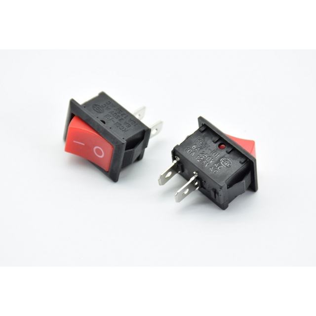 Jednostavni dvopinski prekidač - klackalica (KCD1), max 6A/250V, dimenzije 21 x 15 x 24 mm, težina 4 g, crvene boje.