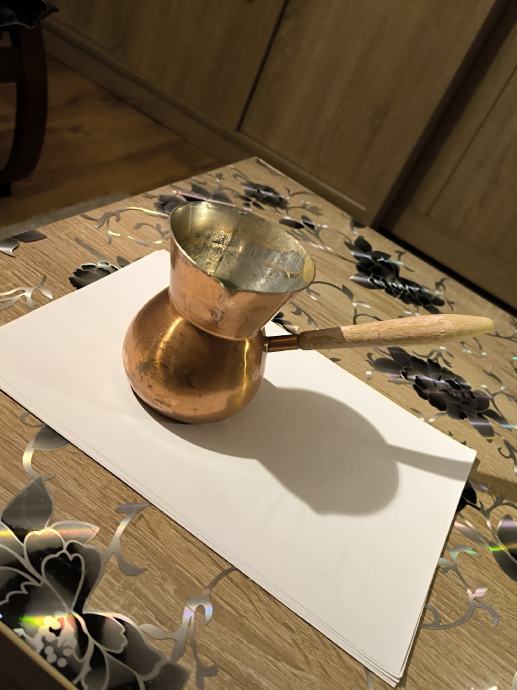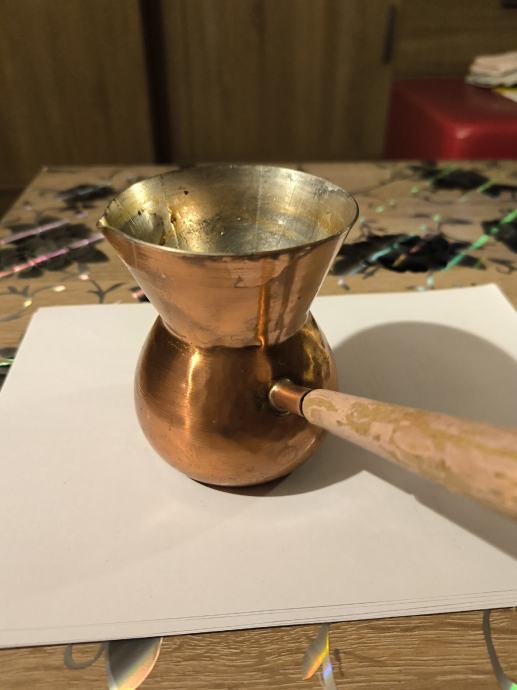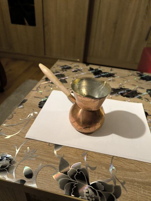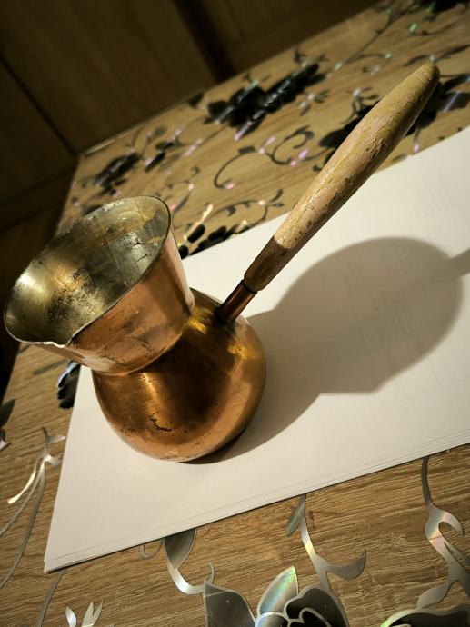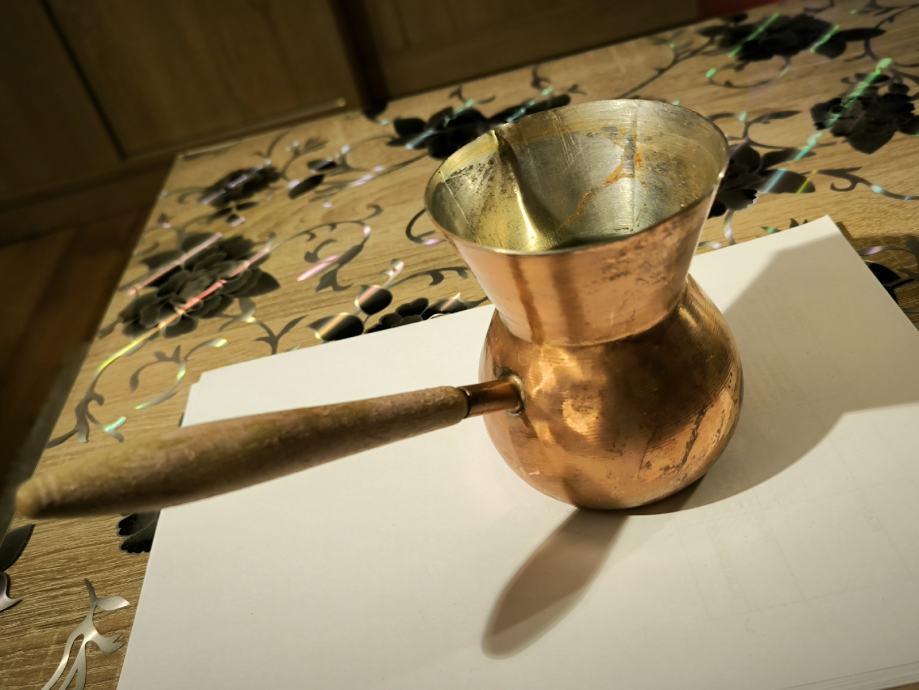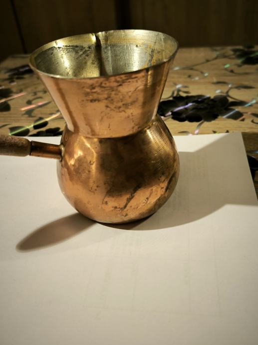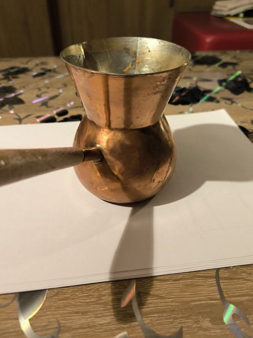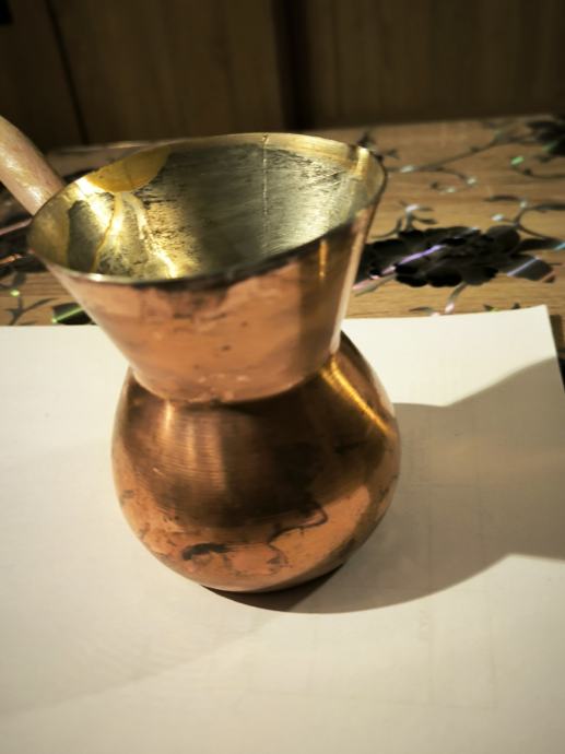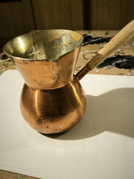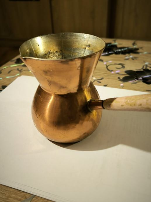 Bakrena džezva za kuhanje turske kave , ručna izrada džezve , čisti bakar , izrada kao od kotla za rakiju , u džezva stane dvije dobre šalice vode za kuhanje turske kave. Voda jako brzo uskuha u njoj , Džezva je bila u upotrebi, ja ne pijem kavu , pa je ne upotrebljavam .plaćanje i dostava sve po dogovoru.