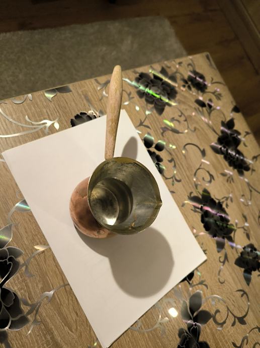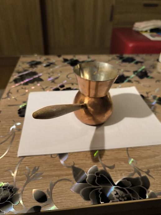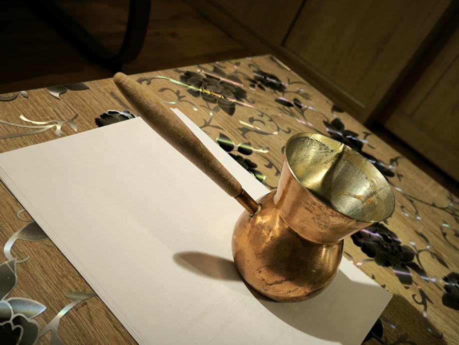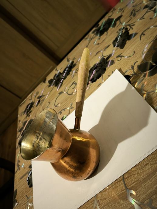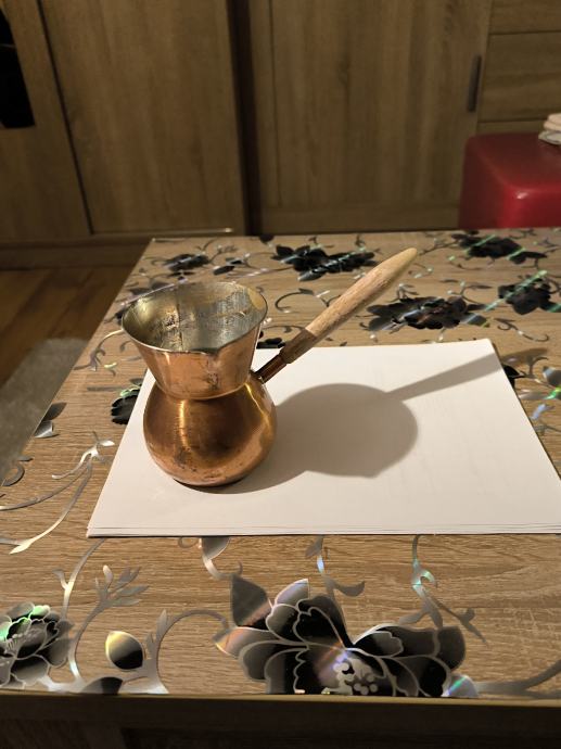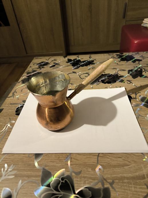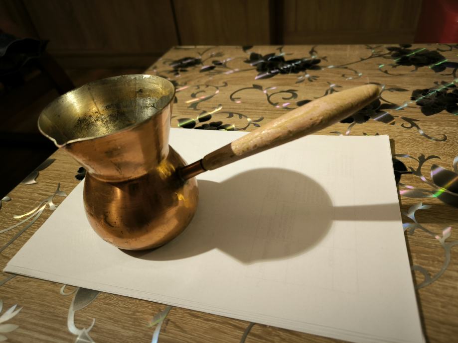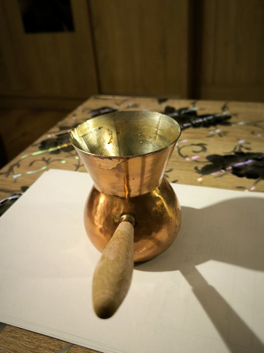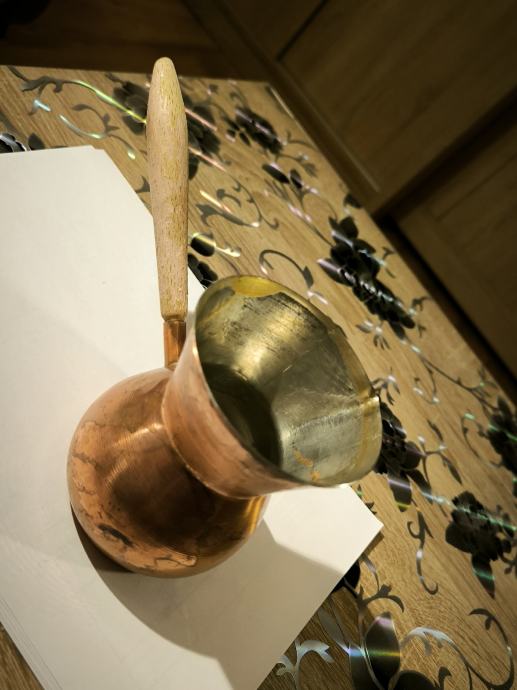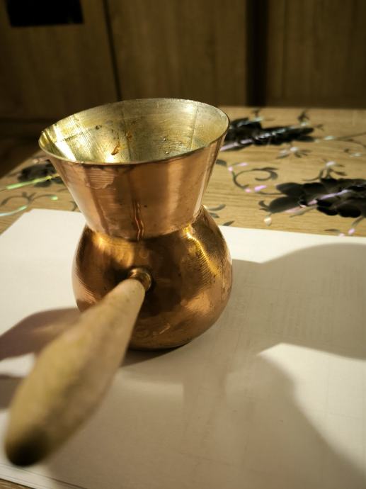 Bakrena džezva za kuhanje turske kave , ručna izrada džezve , čisti bakar , izrada kao od kotla za rakiju , u džezva stane dvije dobre šalice vode za kuhanje turske kave. Voda jako brzo uskuha u njoj , Džezva je bila u upotrebi, ja ne pijem kavu , pa je ne upotrebljavam .plaćanje i dostava sve po dogovoru.