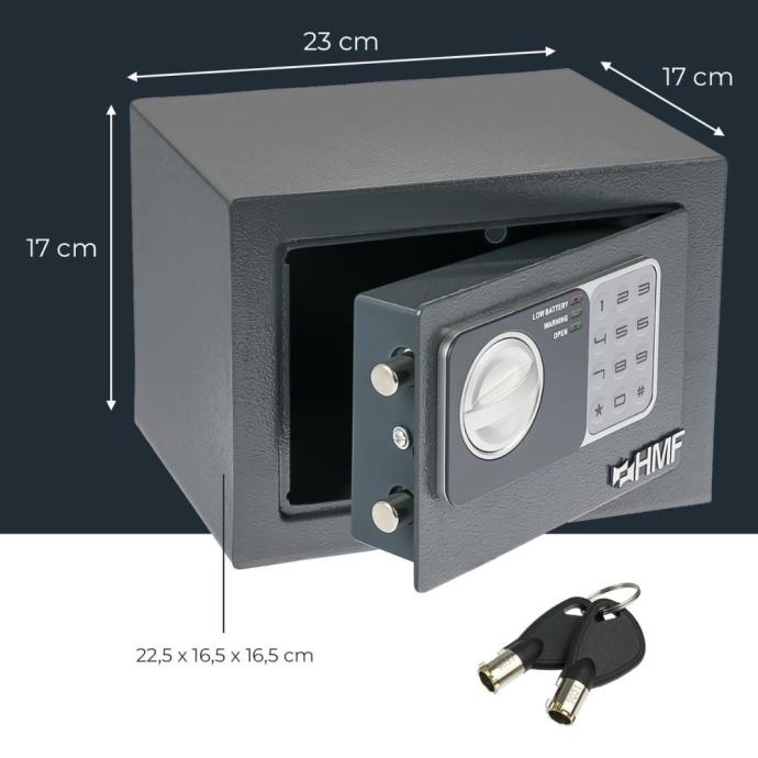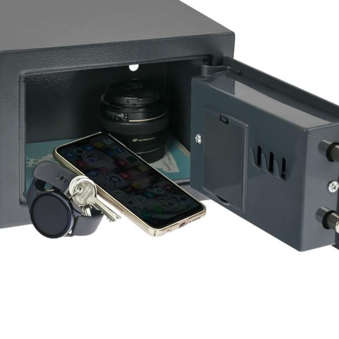 S dimenzijama od 23 x 17 x 17 cm, ovaj sef je dovoljno kompaktan da stane u bilo koji prostor, a istovremeno dovoljno prostoran za pohranu vaših vrijednosti. Unutrašnjost se prilagođava DIN A5 dokumentima, pa je idealan za pohranu važnih papira, novca, nakit i druge male dragocjenosti. Njegova kompaktnost ne znači da je manje siguran. Sef je izrađen od čeličnog kućišta debljine 2 mm, a vrata debljine 4 mm opremljena su dvostrukim zasunom, što jamči visoku otpornost na pokušaje provale.