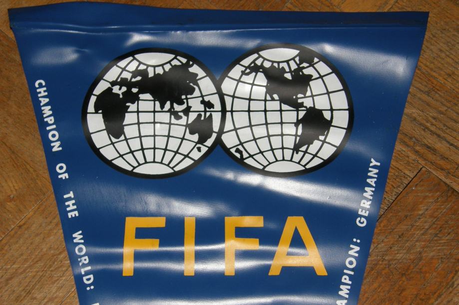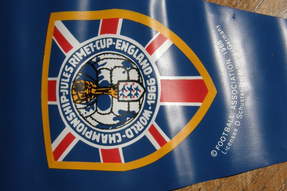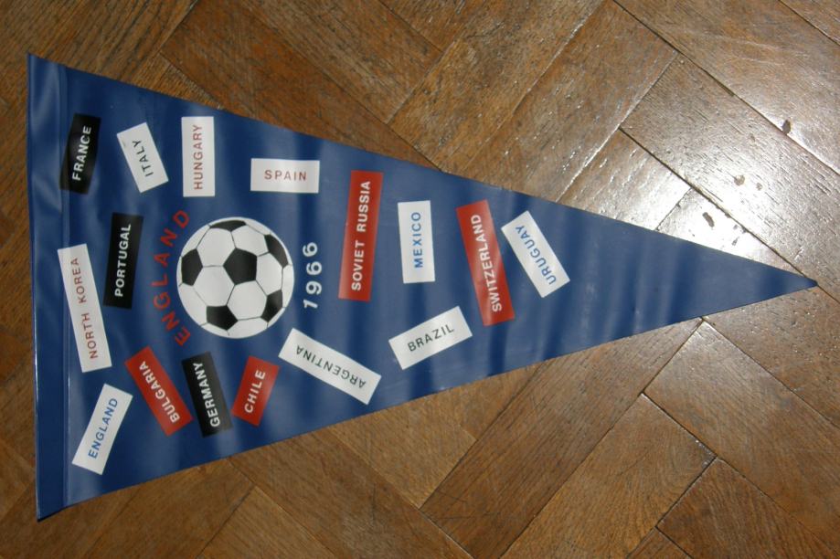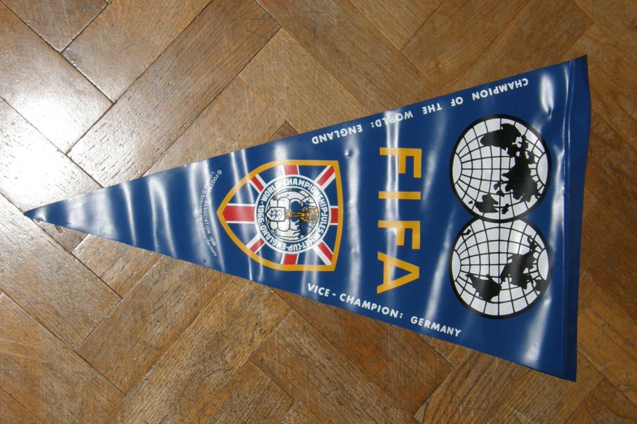 Fifa World Championship Jules Rimet cup England 1966.Zadnji Engleski trofej osvojen na Svjetskom nogometnom prvenstvu.Originalna plastična zastava Fifa svjetskog nogometnog prvenstva iz 1966.Na prednjoj strani su otisnuti prvak Engleska i viceprvak Njemačka,a na zadnjoj svi sudionici prvenstva.Zastava je cca veličine :49x29cm.Stanje je dobro,kao na slikama.