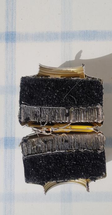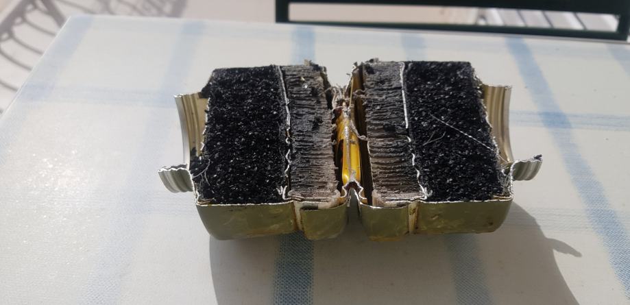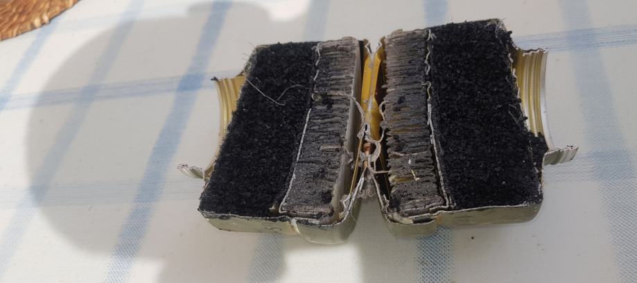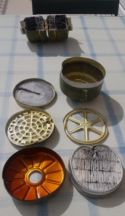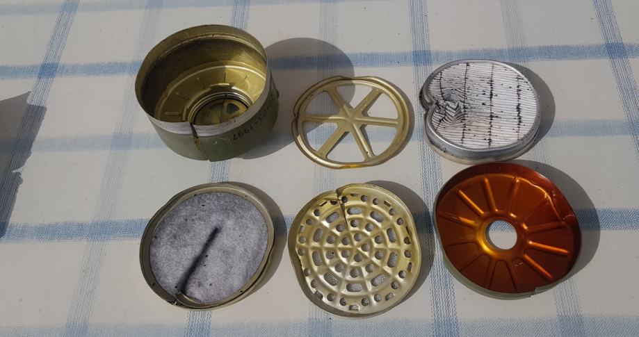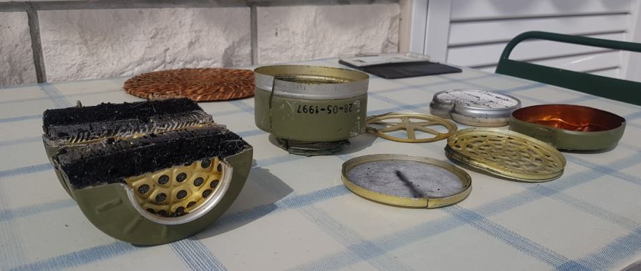 ***U slikama je prikazan presijek filtera JNA gas maske i bočno jedan rastavljeni, da se vidi princip rada filtriranja zraka. Prvo je natopljen vodom da ne ispadne rasuti ugljen iznutra, a onda raspilan ručnom pilom za željezo.