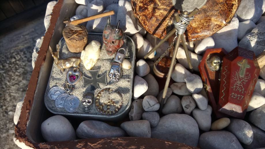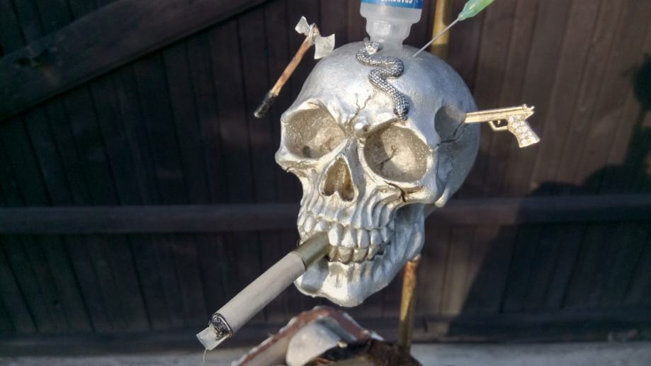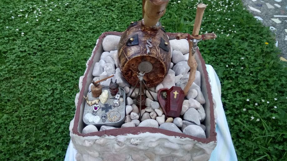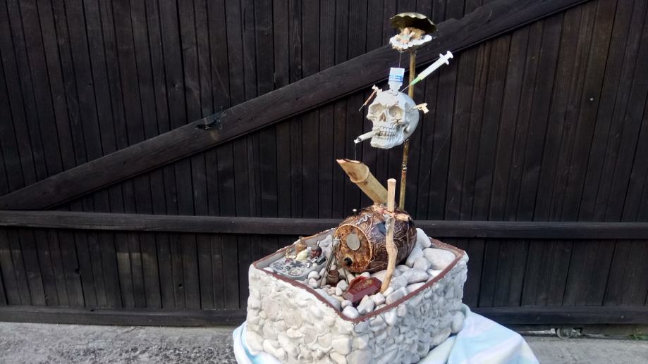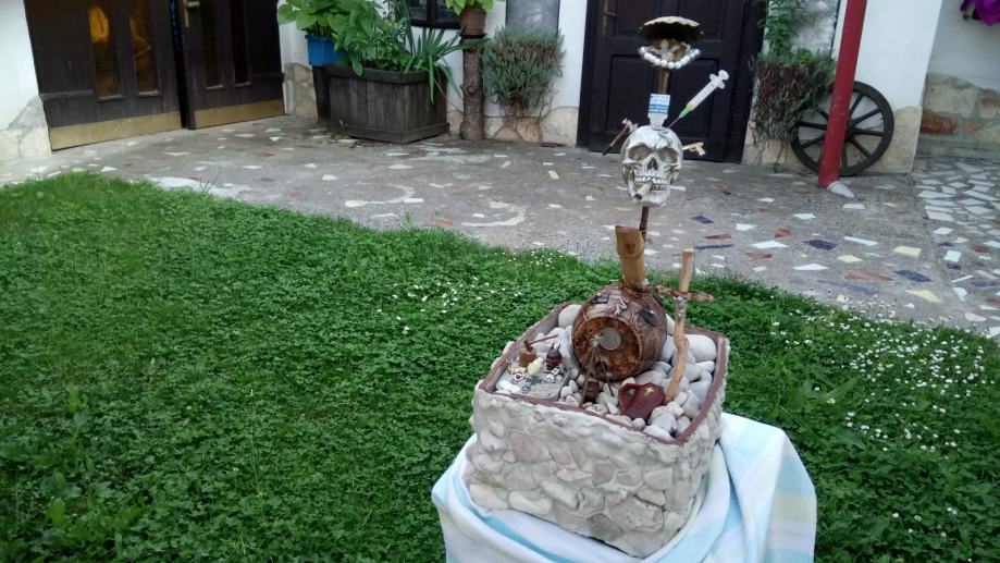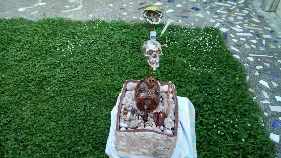 Dekorativna fontana sa tematikom života i smrti,napravljena ručno od 27 raznih minijaturnih detalja koji su ručno napravljeni.Voda teče sa vrha iz školjke kroz mrtvačku glavu i kroz usta lubanje teče do bačvice i onda iz nje u kotlić.U postolje fontane (posude sa deko-kamenom) je ugrađena pumpa za fontane marke ,,Oaza,, koja pumpa vodu na vrh fontane.Na dnu su prikazani dijelovi Pakla sa lijeve strane na slici i Raja i Uskrsnuća na desnoj strani (na slici). Izrada fontane je trajala 5.dana i ručni je rad i unikat (rađena je bez šablone) !! Cijena je 55,00 Eura i ne šaljem je poštom radi mogućih oštećenja i velikih dimenzija-preuzimanje je osobno, nakon pregleda stanja fontane.