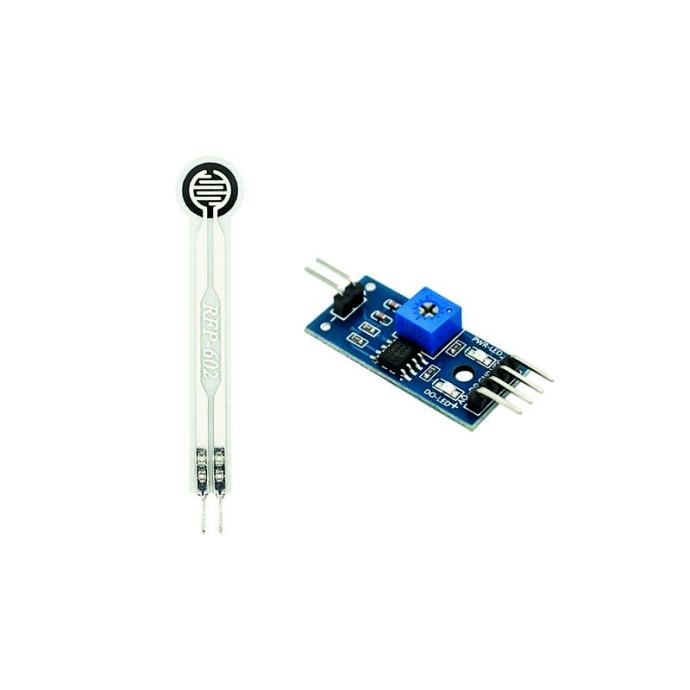 Okrugli senzor pritiska (FSR - Force Sensitive Resistor) promjera 10 mm, čiji otpor se mijenja s pritiskom - čim je pritisak veći (do max ~20 N), tim je otpor manji. Ovaj odnos nije linearan pa se ne preporučuje za mjerenje, nego za detekciju razlike u jačini pritiska. Uz FSR dolazi i modul koji pojednostavljuje spajanje, a ima analogni i digitalni izlaz (s podesivim pragom). Radi s 3.3 i 5 V logikom i napajanjem.