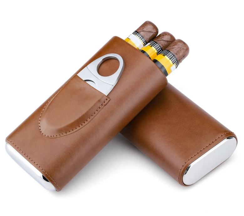 Kožna kutija za tricigare, prijenosna ciga humidor, kožna kutija sa srebrnim rezačem za ciga